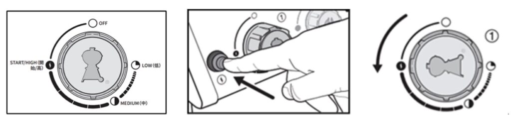 ②蓋を開け、⚡マークの点火ボタンを長押しし、同時に左側のつまみを押しながら90°回します。(画像のSTARTの位置まで)