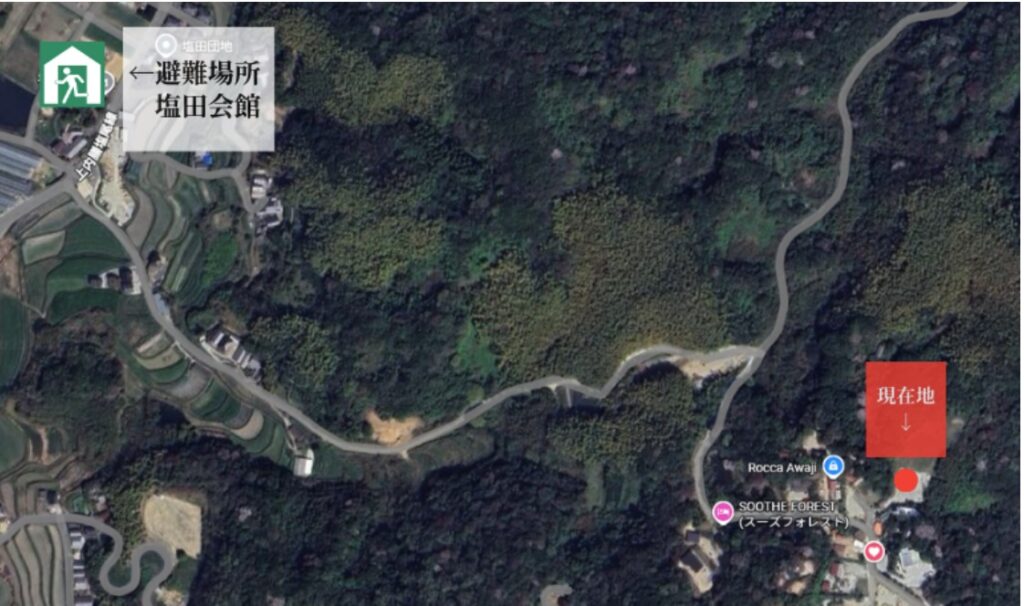 津波・洪水・高潮等の際の避難場所は 「塩田会館(淡路市下司1177-1) 」 となります。